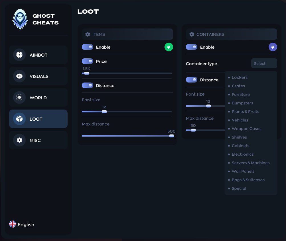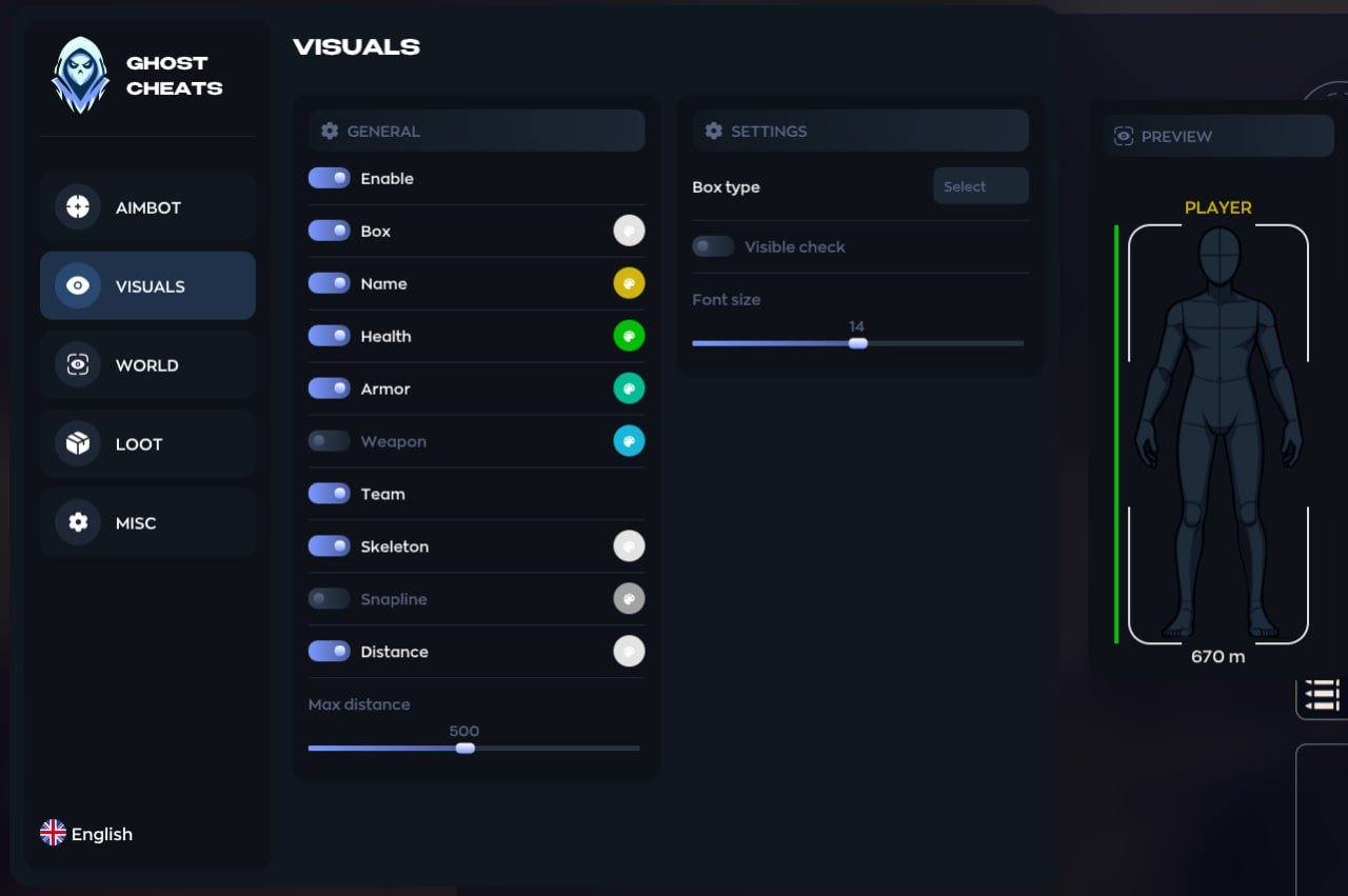 Ghost — стабильный приватный чит для ARC Raiders и стильным фирменным меню. Аимбот: FOV, smooth, дистанция, приоритет (FOV/дистанция/HP), visible check, ближайшая кость. ESP: боксы (default/corner/filled), имена, HP, броня, оружие, команда, скелет, snapline. Дроны (20+ типов), Loot ESP (предметы/контейнеры с фильтрами). Радар, Rapid Fire, Battle Mode, VSync, конфиги, OBS Bypass.
