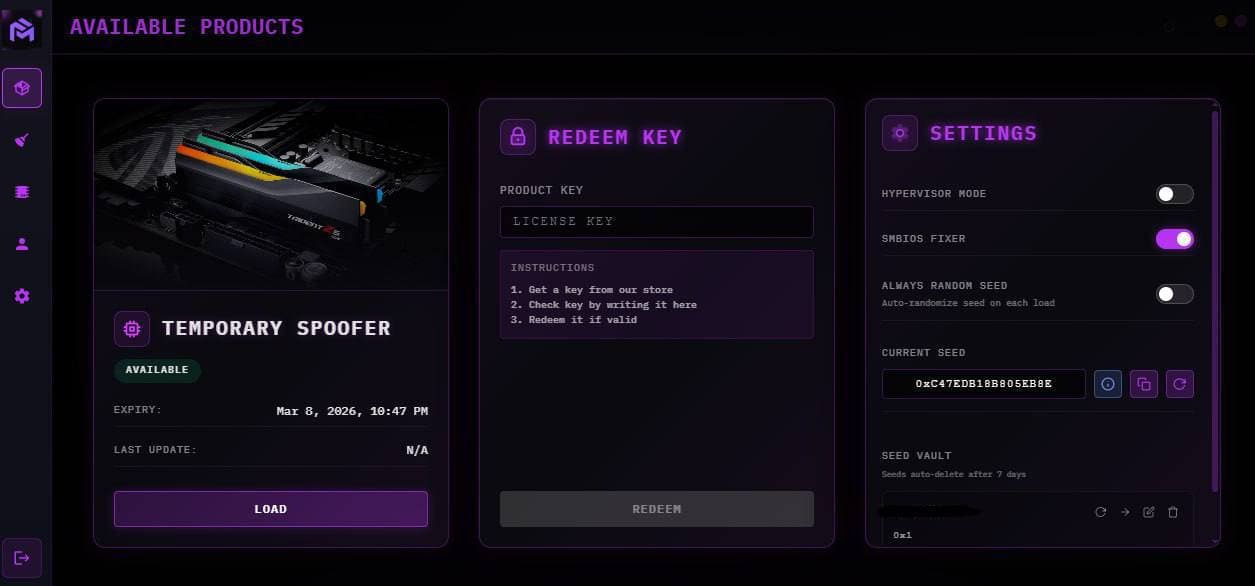 Temp Spoofer - Новый продукт! Забанен по HWID в EAC/BattlEye/ACE/RICOCHET? Забудьте о переустановке Windows и BIOS. Временный спуфер маскирует железо на лету - чистый ПК, без следов. Ключевые фичи: Без переустановки Windows. Без прошивки BIOS/UEFI — безопасно для всех. Максимум мощности. Минимум усилий. Запуск в один клик Продвинутый seed-based спуфинг для топ-обхода. Полный спуфинг диска и ARP. Маскировка GPU hardware ID. Авто-спуфинг EFI для глубокого обхода античита. Лёгкий и оптимизированный - без дропа FPS. Максимум мощности. Минимум усилий.