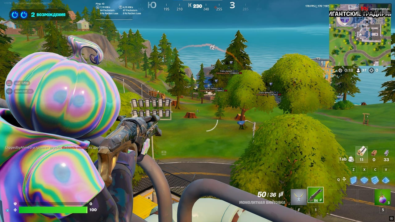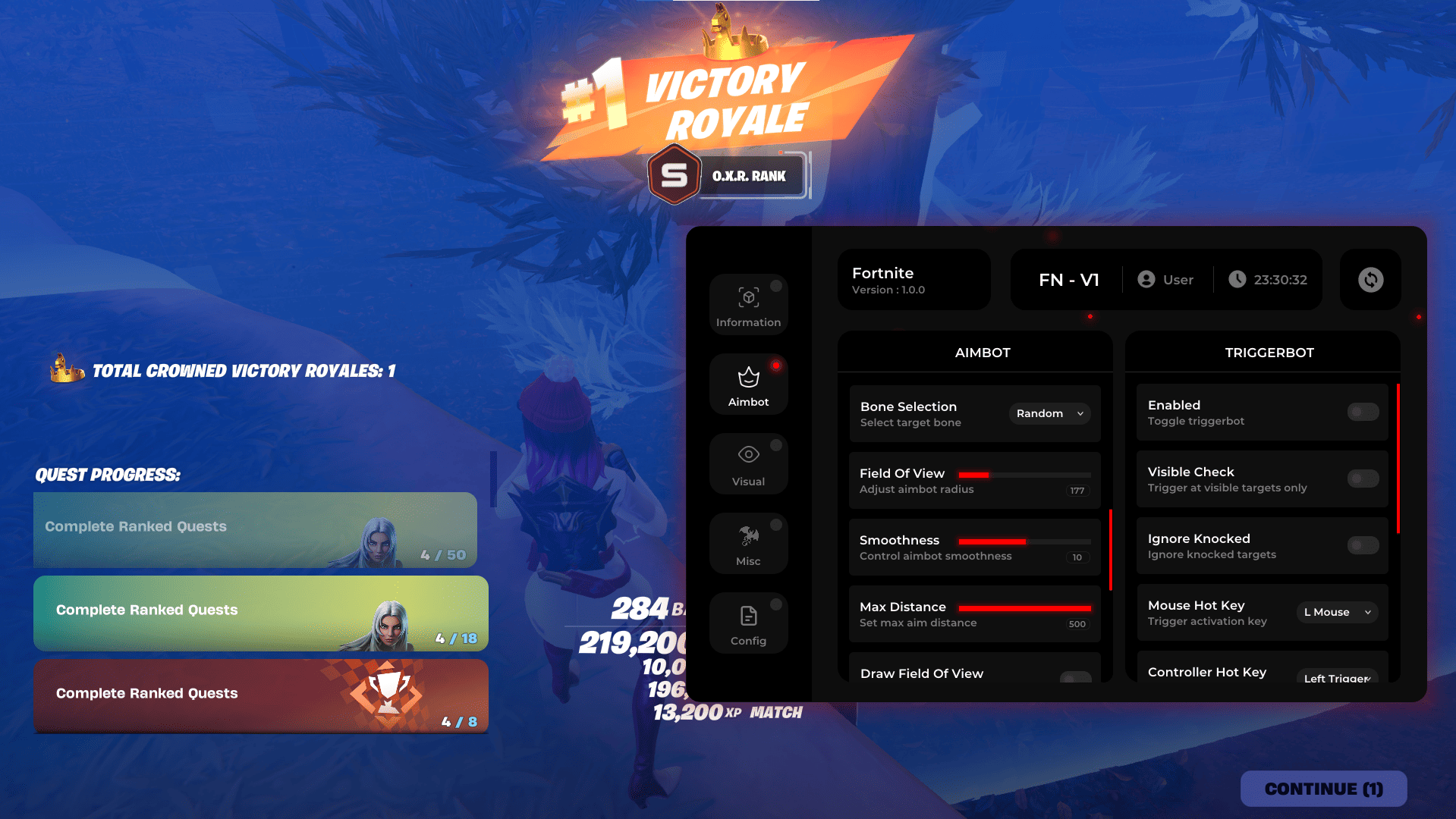 Unnamed — надёжный приватный софт для Fortnite. Точный аимбот с предсказанием движения, FOV, плавностью, выбором костей, видимостью/игнор нокдаун. ESP: 2D-боксы, ники, ранг, платформа, оружие, убийства, стрелки, snaplines, 2D-радар. Loot ESP: сундуки, предметы, ящики патронов, фильтр редкости. StreamProof, конфиги, счётчик игроков. Универсально!